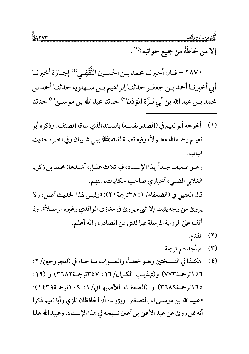 ٢٨٧٠ - قال أخبرنا محمد بن الحسين الثقفِي (¬٢) إجازة أخبرنا أبي أخبرنا أحمد بن جعفر حدثنا إبراهيم بن سهلويه حدثنا أحمد بن محمد بن عبد الله بن أبي بَرَّة المؤذِّن (¬٣) حدثنا عبد الله بن موسى (¬٤) حدثنا