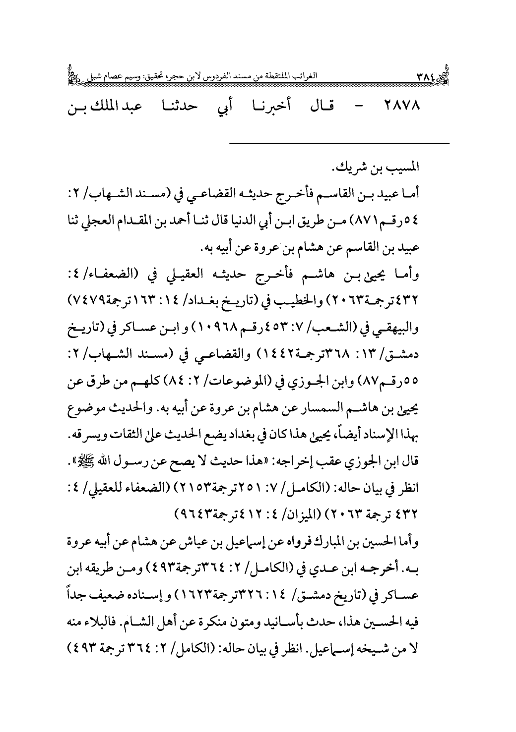 وأمَّا الحسين بن المُباركِ فرواه عن إسماعيل بن عياش عن هشام عن أبيه عروة به. أخرجه ابن عدي في (الكامل/ ٢: ٣٦٤ ترجمة ٤٩٣) ومن طريقه ابن عساكر في (تاريخ دمشق / ١٤: ٣٢٦ ترجمة ١٦٢٣) وإسناده ضعيف جدًّا فيه الحسين هذا، حدث بأسانيد ومتون منكرة عن أهل الشام. فالبلاء منه لا من شيخه إسماعيل. انظر في بيان حاله: (الكامل/ ٢: ٣٦٤ ترجمة ٤٩٣) =