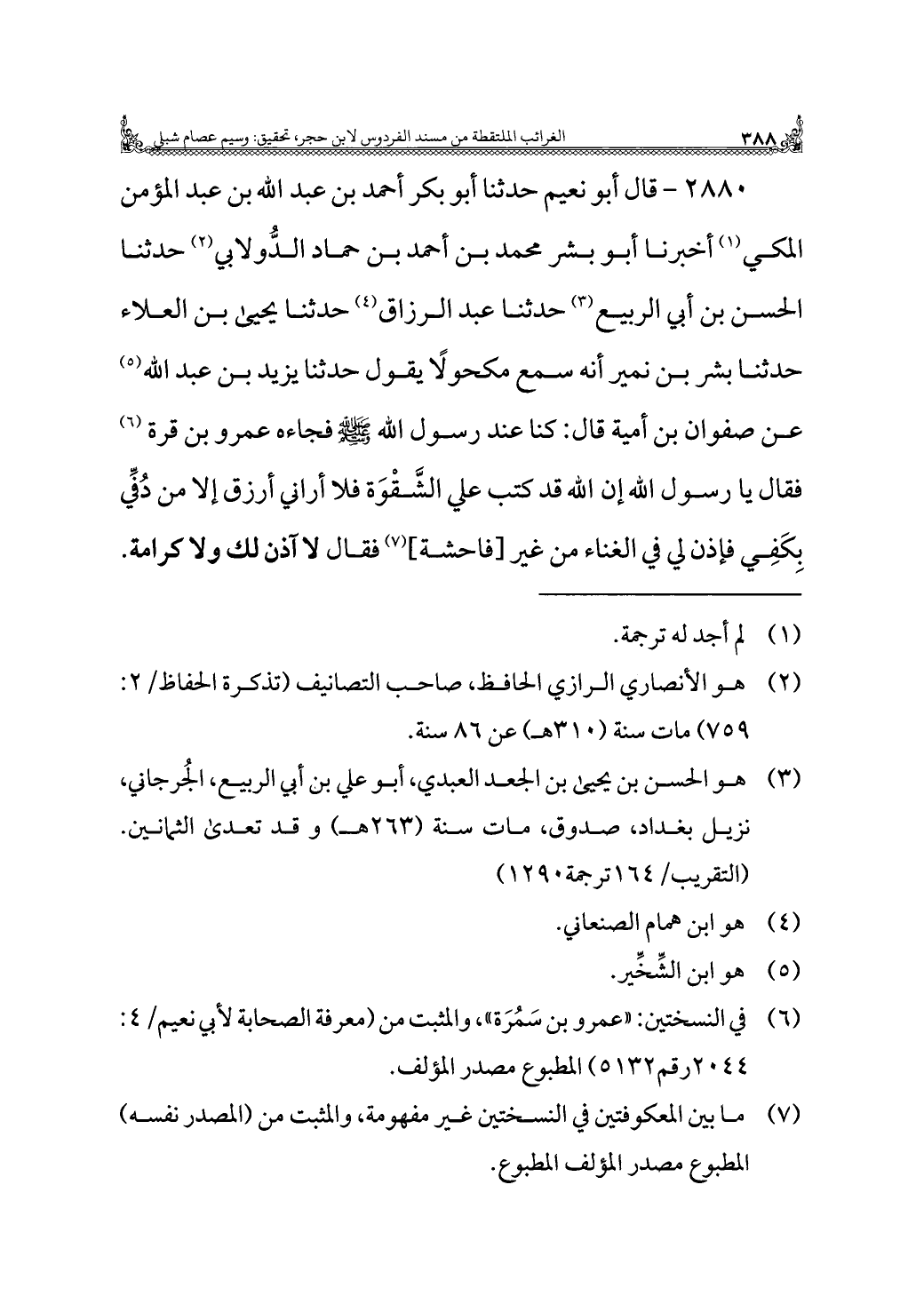 ٢٨٨٠ - قال أبو نعيم حدثنا أبو بكر أحمد بن عبد الله بن عبد المؤمن المكي (¬١) أَخْبَرَنَا أبو بشر محمد بن أحمد بن حماد الدُّولابي (¬٢) حدثنا الحسن بن أبي الربيع (¬٣) حدثنا عبد الرزَّاق (¬٤) حدثنا يحيى بن العلاء حدثنا بشر بن نمير أنه سمع مكحولًا يقول حدثنا يزيد بن عبد الله (¬٥) عن صفوان بن أمية قال: كنا عند رسول الله - صَلَّى اللهُ عَلَيْهِ وَسَلَّمَ - فجاءه عمرو بن قرة (¬٦) فقال يا رسول الله إن الله قد كتب علي الشَّقْوَة فلا أراني أرزق إلَّا من دُفِّي بِكَفي فإذن لي في الغناء من غير [فاحشة] (¬٧) فقال لا آذن لك ولا كرامة.