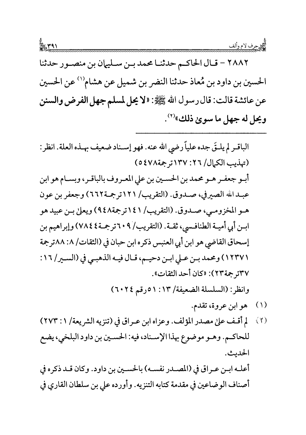 ٢٨٨٢ - قال الحاكم حدثنا محمد بن سليمان بن منصور حدثنا الحسين بن داود بن مُعاذ حدثنا النضر بن شميل عن هشام (¬١) عن الحسين عن عائشة قالت: قال رسول الله - صَلَّى اللهُ عَلَيْهِ وَسَلَّمَ -: "لا يحل لمسلم جهل الفرض والسنن ويحل له جهل ما سوى ذلك" (¬٢).