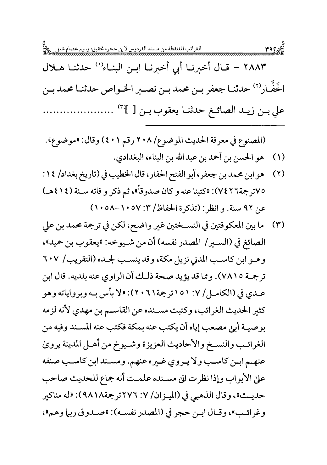 ٢٨٨٣ - قال أَخْبَرَنَا أبي أَخْبَرَنَا ابن البناء (¬١) حدثنا هلال الحَفَّار (¬٢) حدثنا جعفر بن محمد بن نصير الخواص حدثنا محمد بن علي بن زيد الصائغ حدثنا يعقوب بن [] (¬٣)
