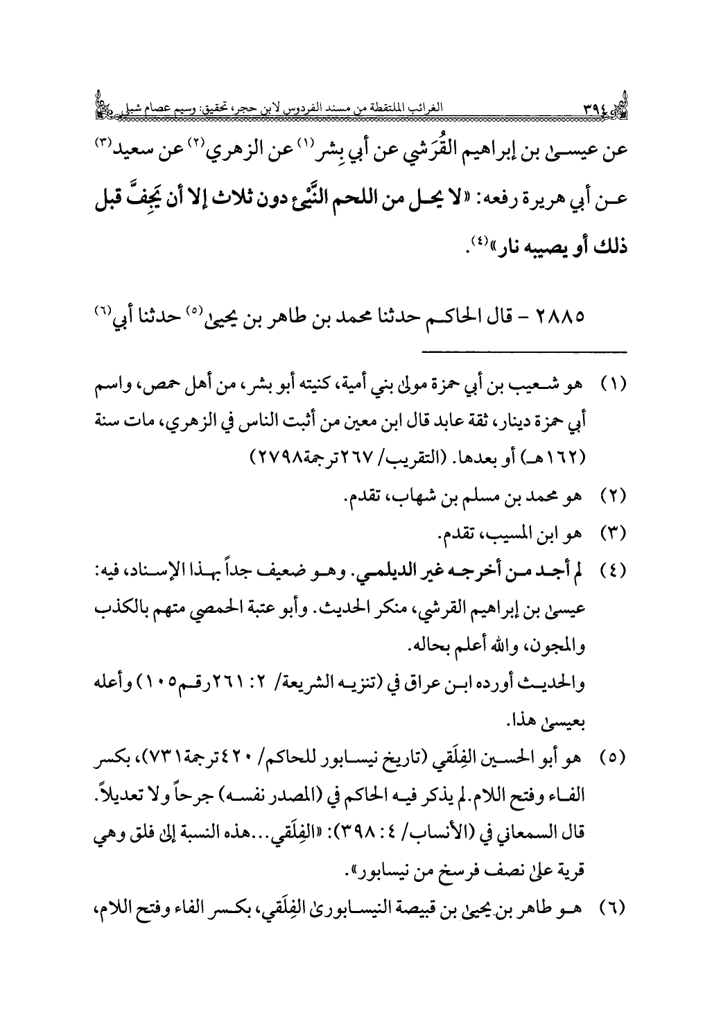 (¬٥) هو أبو الحسين الفِلَقي (تاريخ نيسابور للحاكم/ ٤٢٠ ترجمة ٧٣١)، بكسر الفاء وفتح اللام. لم يذكر فيه الحاكم في (المصدر نفسه) جرحًا ولا تعديلًا. قال السمعاني في (الأنساب/ ٤: ٣٩٨): "الفِلَقي ... هذه النسبة إلى فلق وهي قرية على نصف فرسخ من نيسابور".