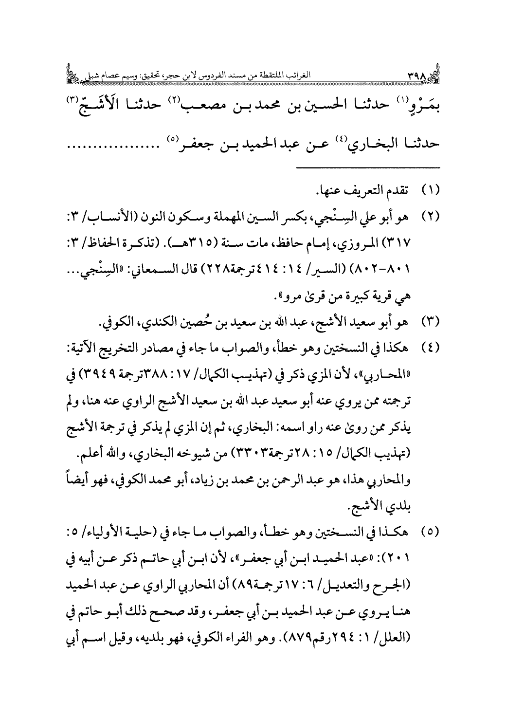 بمَرْوٍ (¬١) حدثنا الحسين بن محمد بن) ب (¬٢) حدثنا الْأَشَجّ (¬٣) حدثنا البخاري (¬٤) عن عبد الحميدبن جعفر (¬٥)