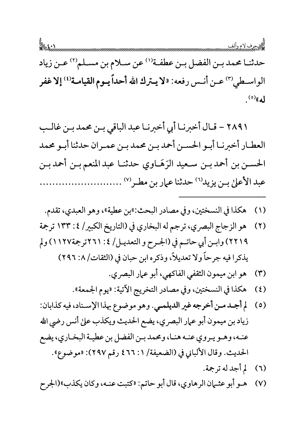 حدثنا محمد بن الفضل بن عطفة (¬١) عن سلام بن مسلم (¬٢) عن زياد الواسطي (¬٣) عن أنس رفعه: "لا يترك الله أحدًا يوم القيامة (¬٤) إلَّا غفر له" (¬٥).