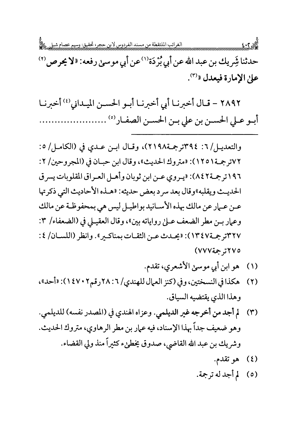 حدثنا شِريك بن عبد الله عن أبي بُرْدَة (¬١) عن أبي موسى رفعه: "لا يحرص (¬٢) على الإمارة فيعدل" (¬٣).