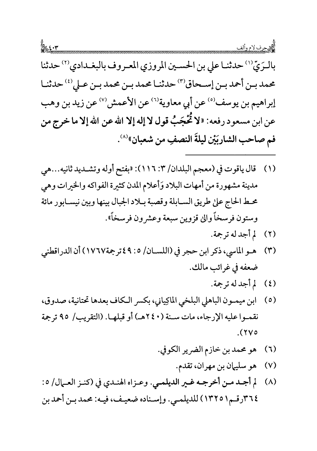 بالرَيّ (¬١) حدثنا علي بن الحسين المروزي المعروف بالبغدادي (¬٢) حدثنا محمد بن أحمد بن إسحاق (¬٣) حدثنا محمد بن محمد بن علي (¬٤) حدثنا إبراهيم بن يوسف (¬٥) عن أبي معاوية (¬٦) عن الأعمش (¬٧) عن زيد بن وهب عن ابن مسعود رفعه: "لا تُحْجَبُ قول لا إله إلَّا الله عن الله إلَّا ما خرج من فم صاحب الشاربَيْن ليلةَ النصفِ من شعبان" (¬٨).