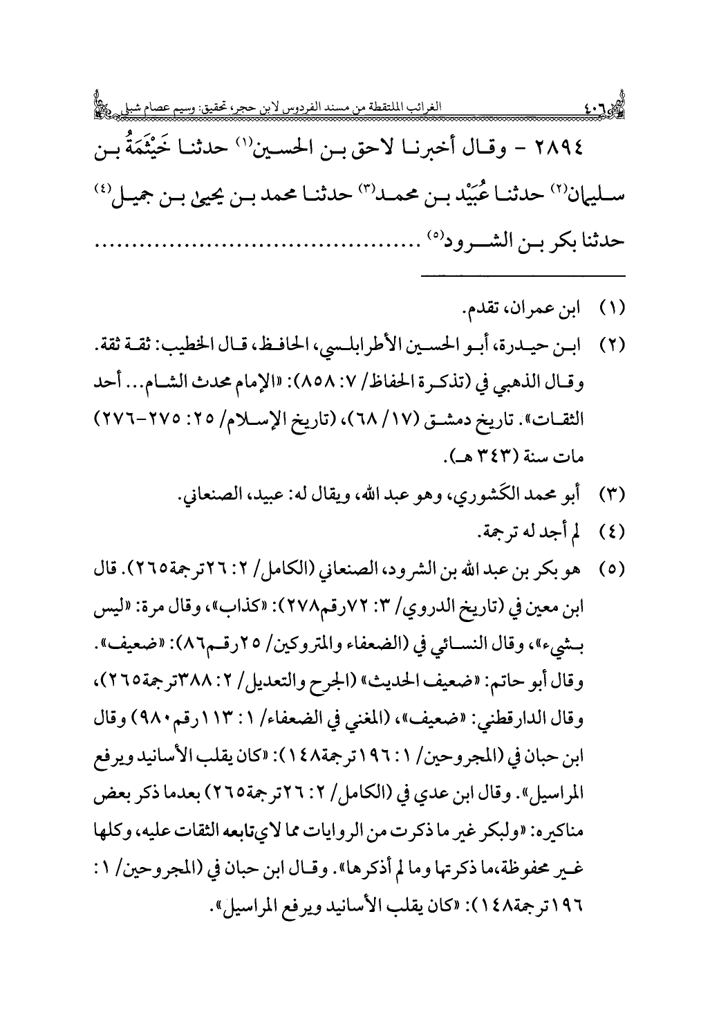 ٢٨٩٤ - وقال أَخْبَرَنَا لاحق بن الحسين (¬١) حدثنا خَيْثَمَةُ بن سليمان (¬٢) حدثنا عُبَيْد بن محمد (¬٣) حدثنا محمد بن يحيى بن جميل (¬٤) حدثنا بكر بن الشرود (¬٥)