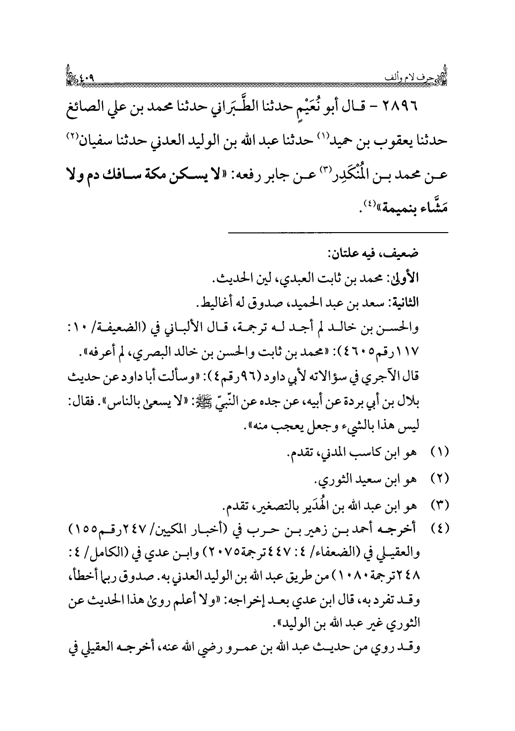 ٢٨٩٦ - قال أبو نُعَيْمٍ حدثنا الطَّبَراني حدثنا محمد بن علي الصائغ حدثنا يعقوب بن حميد (¬١) حدثنا عبد الله بن الوليد العدني حدثنا سفيان (¬٢) عن محمد بن المُنكَدِر (¬٣) عن جابر رفعه: "لا يسكن مكة سافك دم ولا مَشَّاء بنميمة" (¬٤).