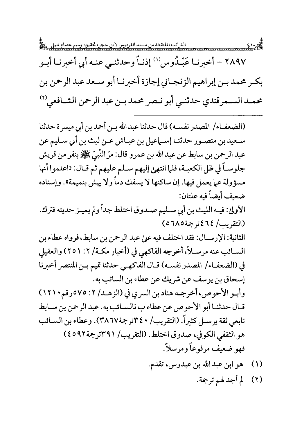 ٢٨٩٧ - أَخْبَرَنَا عَبْدُوس (¬١) إذنًا وحدثني عنه أبي أَخْبَرَنَا أبو بكر محمد بن إبراهيم الزنجاني إجازة أَخْبَرَنَا أبو سعد عبد الرَّحمن بن محمد السمرقندي حدّثني أبو نصر محمد بن عبد الرَّحمن الشافعي (¬٢)