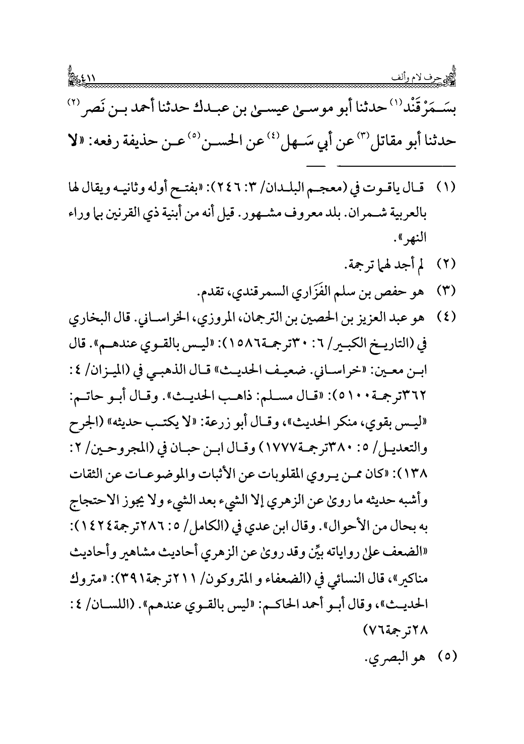 بسَمَرْقَنْد (¬١) حدثنا أبو موسى عِيسَى بن عبدك حدثنا أحمد بن نَصر (¬٢) حدثنا أبو مقاتل (¬٣) عن أبي سَهل (¬٤) عن الحسن (¬٥) عن حذيفة رفعه: "لا