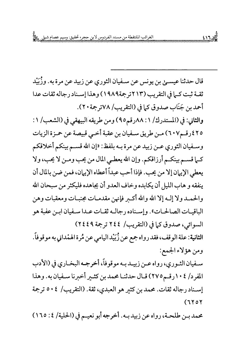 والثاني: في (المستدرك/ ١: ٨٨ رقم ٩٥) ومن طريقه البيهقي في (الشعب/ ١: ٤٢٥ رقم ٦٠٧) من طريق سفيان بن عُقبة أخي قبيصة عن حمزة الزيات وسفيان الثوري عن زبيد عن مرة به بلفظ: "إن الله قسم بينكم أخلاقكم كما قسم بينكم أرزاقكم. وإن الله يعطي المال من يحب ومن لا يحب، ولا يعطي الإيمان إلَّا من يحب. فإذا أحب عبدًا أعطاه الإيمان، فمن ضن بالمال أن ينفقه وهاب الليل أن يكابده وخاف العدو أن يجاهده فليكثر من سبحان الله والحمد ولا إله إلَّا الله والله أكبر فإنهن مقدمات مجنبات ومعقبات وهن الباقيات الصالحات". وإسناده رجاله ثقات عدا سفيان بن عقبة هو السوائي، صدوق كما في (التقريب/ ٢٤٤ ترجمة ٢٤٤٩)