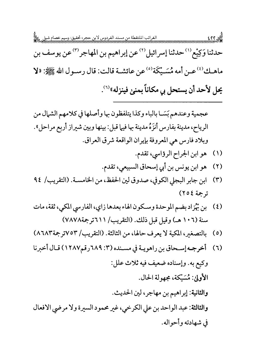 حدثنا وَكِيْع (¬١) حدثنا إسرائيل (¬٢) عن إبراهيم بن المهاجر (¬٣) عن يوسف بن ماهك (¬٤) عن أمه مُسَيْكَة (¬٥) عن عائشة قالت: قال رسول الله - صَلَّى اللهُ عَلَيْهِ وَسَلَّمَ -: "لا يحل لأحد أن يستحل بي مكانًا بمنى فينزله" (¬٦).