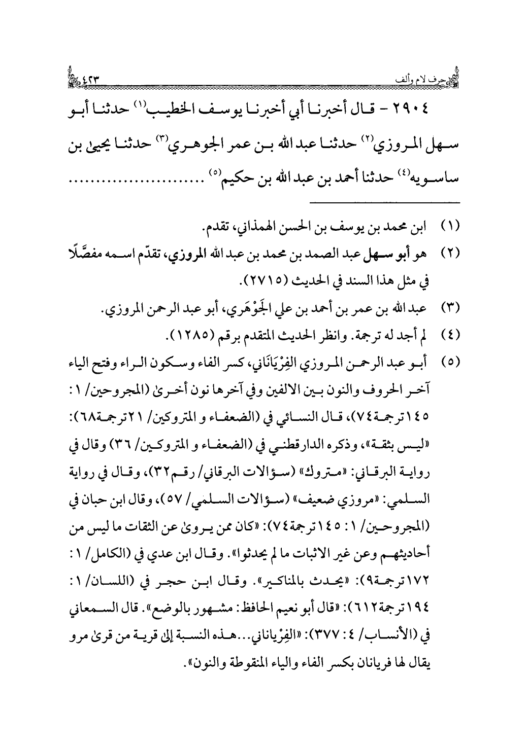 (¬٥) أبو عبد الرَّحمن المروزي الفِرْيَانَاني، كسر الفاء وسكون الراء وفتح الياء آخر الحروف والنون بين الألفين وفي آخرها نون أخرى (المجروحين/ ١: ١٤٥ ترجمة ٧٤)، قال النسائي في (الضعفاء والمتروكين/ ٢١ ترجمة ٦٨): "ليس بثقة"، وذكره الدارقطني في (الضعفاء والمتروكين/ ٣٦) وقال في رواية البرقاني: "متروك" (سؤالات البرقاني / رقم ٣٢)، وقال في رواية السُّلَمي: "مروزي ضعيف" (سؤالات السلَمى / ٥٧)، وقال ابن حبان في (المجروحين/ ١: ١٤٥ ترجمة ٧٤): "كان ممن يروى عن الثقات ما ليس من أحاديثهم وعن غير الإثبات ما لم يحدثوا". وقال ابن عدي في (الكامل/ ١: ١٧٢ ترجمة ٩): "يحدث بالمناكير". وقال ابن حجر في (اللسان/ ١: ١٩٤ ترجمة ٦١٢): "قال أبو نعيم الحافظ: مشهور بالوضع". قال السمعاني في (الأنساب/ ٤: ٣٧٧): "الفِرْياناني ... هذه النسبة إلى قرية من قُرى مرو يقال لها فريانان بكسر الفاء والياء المنقوطة والنون".