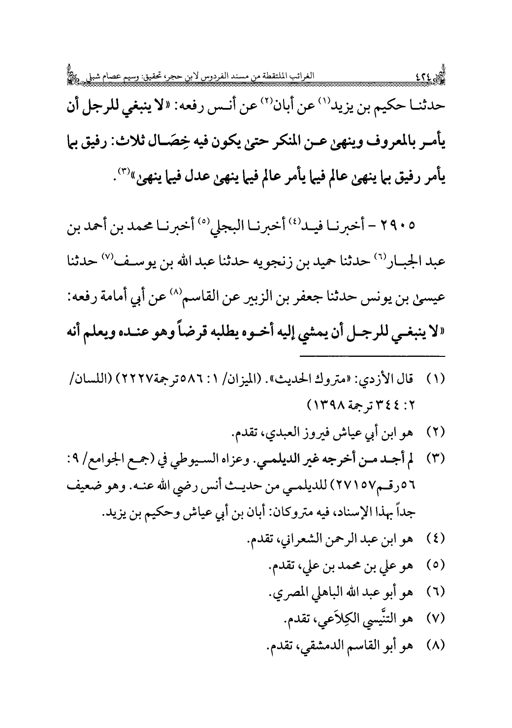 ٢٩٠٥ - أَخْبَرَنَا فيد (¬٤) أَخْبَرَنَا البَجَلي (¬٥) أَخْبَرَنَا محمد بن أحمد بن عبد الجبار (¬٦) حدثنا حميد بن زنجويه حدثنا عبد الله بن يوسف (¬٧) حدثنا عيسى بن يونس حدثنا جعفر بن الزبير عن القاسم (¬٨) عن أبي أمامة رفعه: "لا ينبغي للرجل أن يمشى إليه أخوه يطلبه قرضًا وهو عنده ويعلم أنه