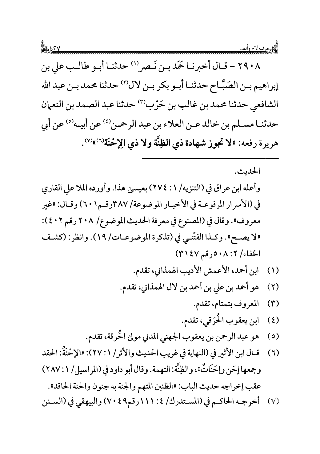 ٢٩٠٨ - قال أخبرنا حَمَد بن نَصر (¬١) حدثنا أبو طالب علي بن إبراهيم بن الصَبَّاح حدثنا أبو بكر بن لال (¬٢) حدثنا محمد بن عبد الله الشافعي حدثنا محمد بن غالب بن حَرْب (¬٣) حدثنا عبد الصمد بن النعمان حدثنا مسلم بن خالد عن العلاء بن عبد الرحمن (¬٤) عن أبيه (¬٥) عن أبي هريرة رفعه: "لا تجوز شهادة ذي الظِنَّة ولا ذي الإِحْنَة (¬٦) " (¬٧).
