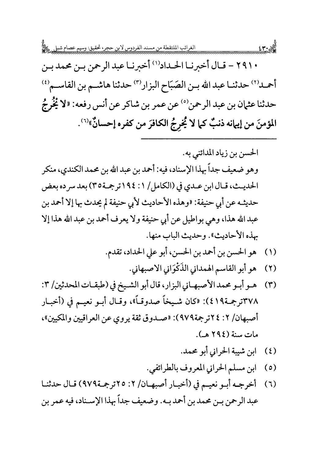 (¬٦) أخرجه أبو نعيم في (أخبار أصبهان/ ٢: ٢٥ ترجمة ٩٧٩) قال حدثنا عبد الرحمن بن محمد بن أحمد به. وضعيف جدًّا بهذا الإسناد، فيه عمر بن =
