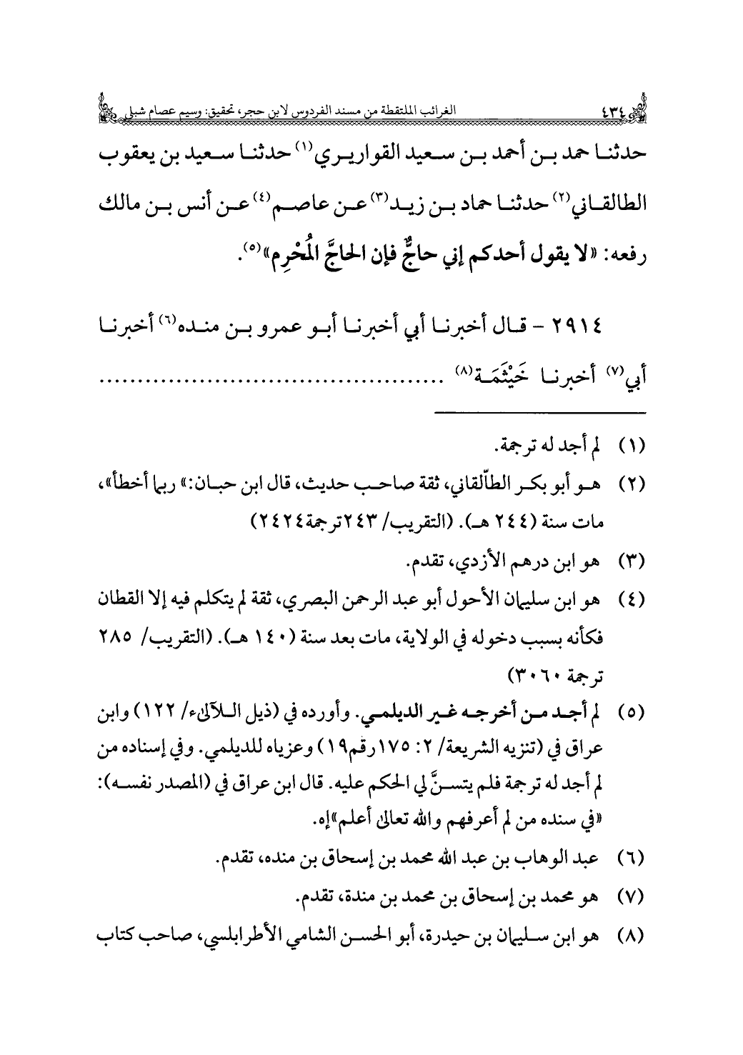 حدثنا حمد بن أحمد بن سعيد القواريري (¬١) حدثنا سعيد بن يعقوب الطالقاني (¬٢) حدثنا حماد بن زيد (¬٣) عن عاصم (¬٤) عن أنس بن مالك رفعه: "لا يقول أحدكم إني حاجٌّ فإن الحاجَّ المُحْرِم" (¬٥).