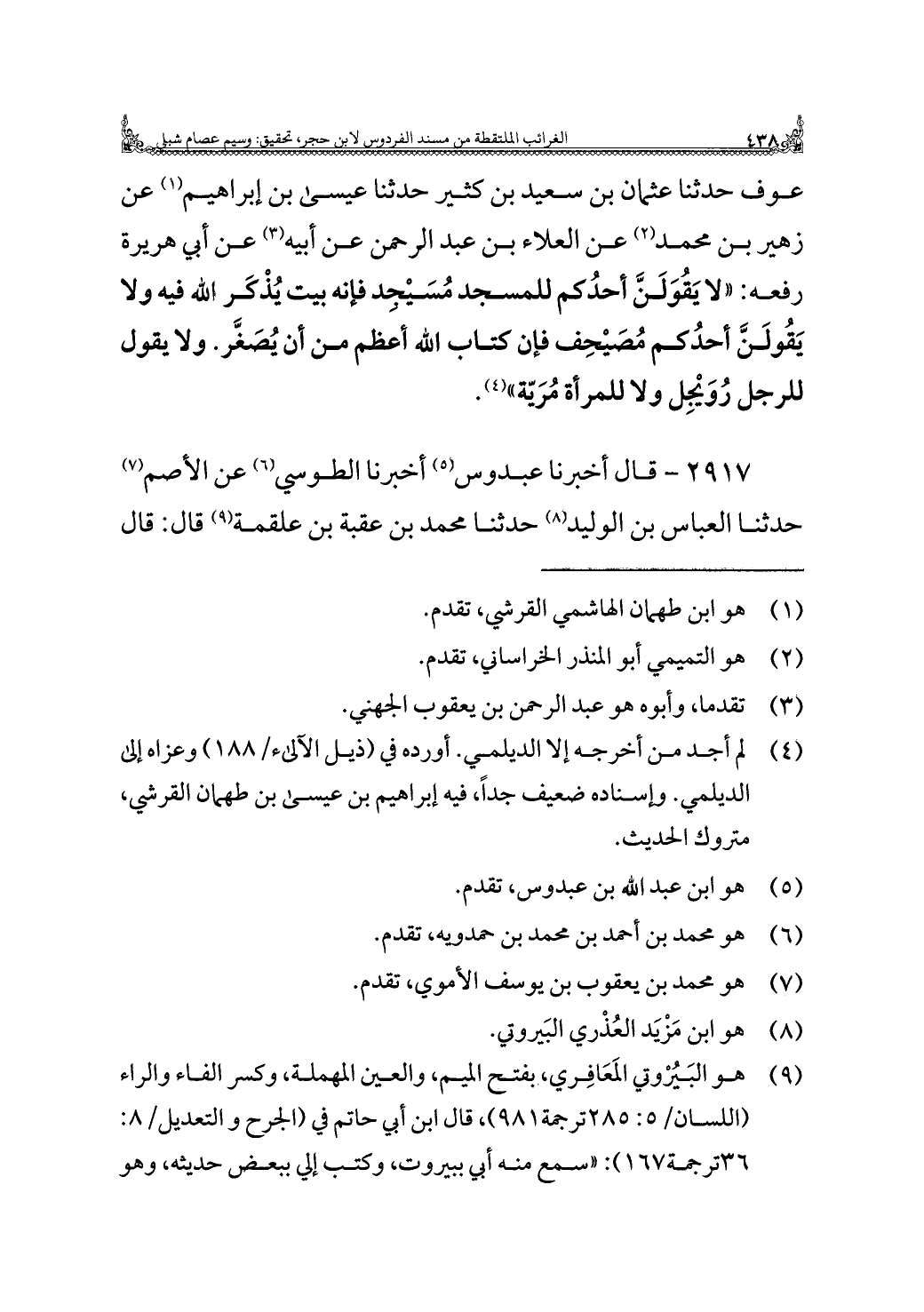 عوف حدثنا عثمان بن سعيد بن كثير حدثنا عيسى بن إبراهيم (¬١) عن زهير بن محمد (¬٢) عن العلاء بن عبد الرحمن عن أبيه (¬٣) عن أبي هريرة رفعه: "لا يَقُوَلَنَّ أحدُكم للمسجد مُسَيْجِد فإنه بيت يُذْكَر الله فيه ولا يَقُولَنَّ أحدُكم مُصَيْحِف فإن كتاب الله أعظم من أن يُصَغَّر. ولا يقول للرجل رُوَيْجِل ولا للمرأة مُرَيّة" (¬٤).