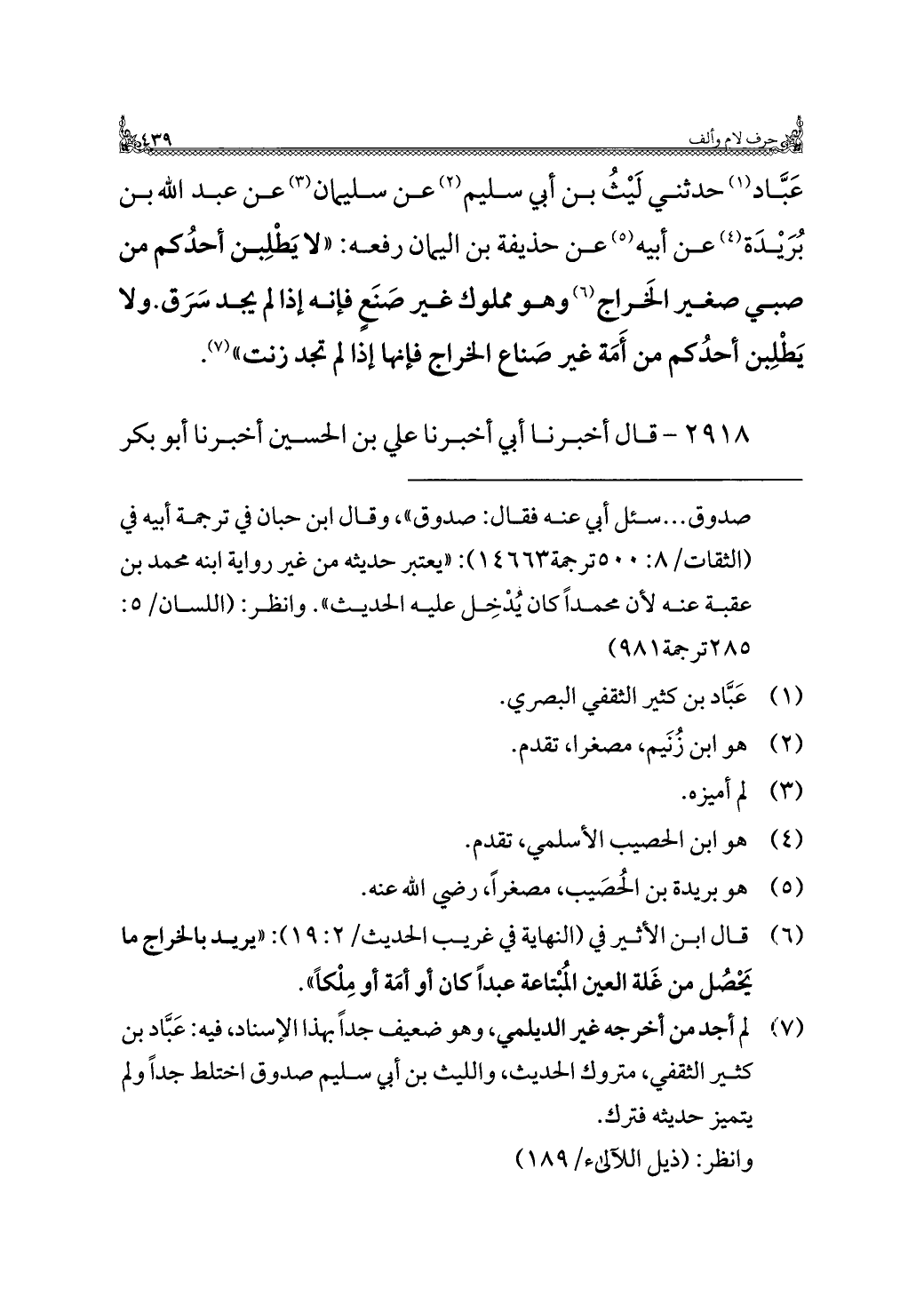 عَبَّاد (¬١) حدثني لَيْثُ بن أبي سليم (¬٢) عن سليمان (¬٣) عن عبد الله بن بُرَيْدَة (¬٤) عن أبيه (¬٥) عن حذيفة بن اليمان رفعه: "لا يَطْلِبن أحدُكم من صبي صغير الخَراج (¬٦) وهو مملوك غير صَنَع فإنه إذا لم يجد سَرَق. ولا يَطْلِبن أحدُكم من أَمَة غير صَناع الخراج فإنها إذا لم تجد رنت" (¬٧).