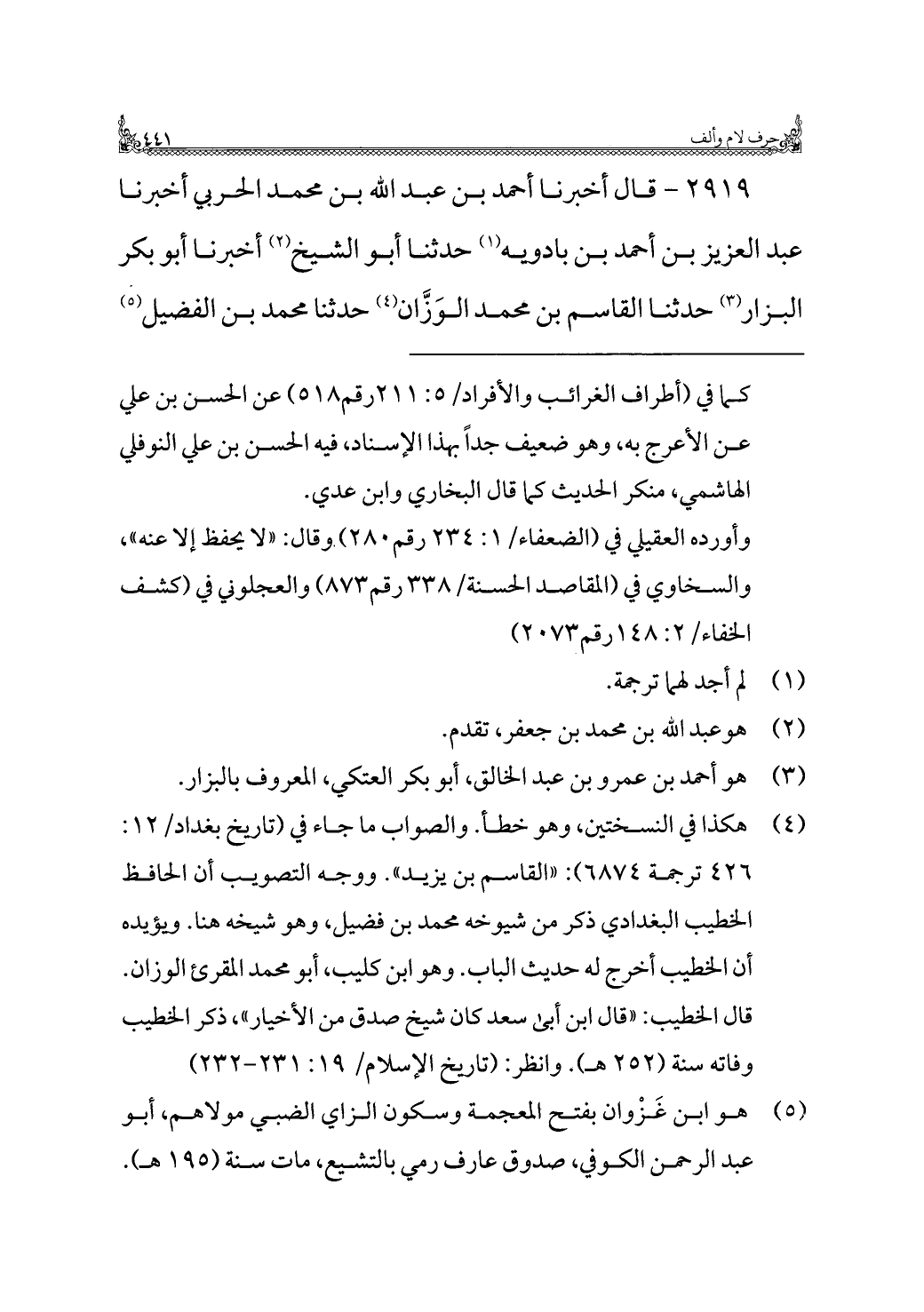 ٢٩١٩ - قال أخبرنا أحمد بن عبد الله بن محمد الحربي أخبرنا عبد العزيز بن أحمد بن بادويه (¬١) حدثنا أبو الشيخ (¬٢) أخبرنا أبو بكر البزار (¬٣) حدثنا القاسم بن محمد الوَزَّان (¬٤) حدثنا محمد بن الفضيل (¬٥)