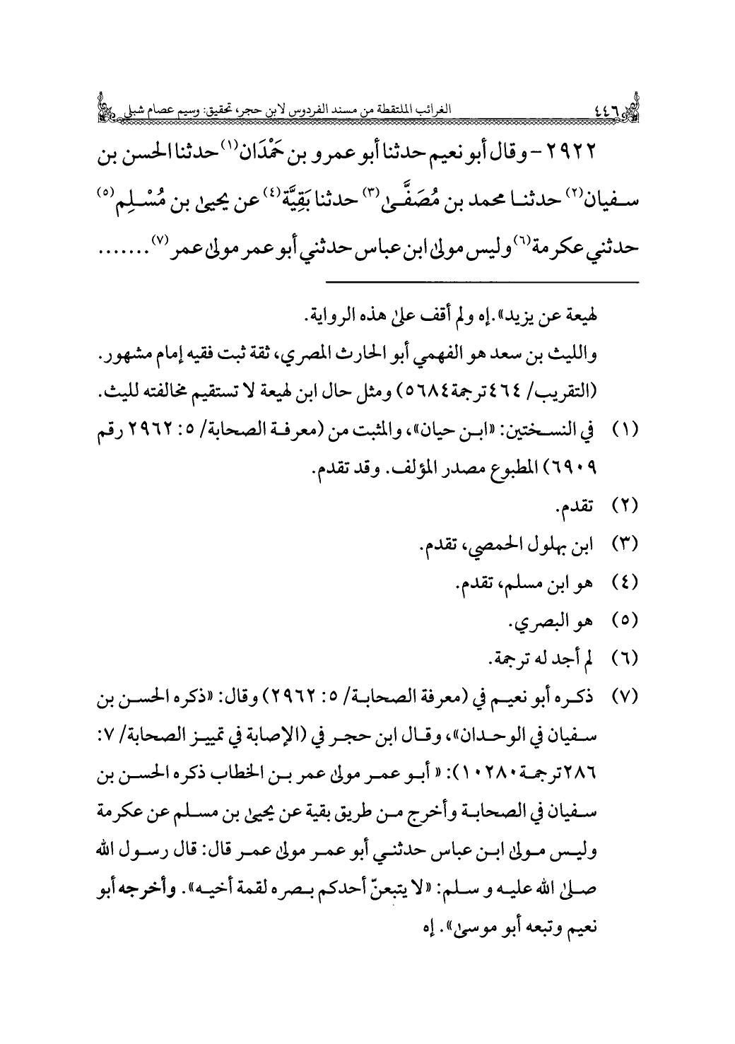 ٢٩٢٢ - وقال أبو نعيم حدثنا أبو عمرو بن حَمْدَان (¬١) حدثنا الحسن بن سفيان (¬٢) حدثنا محمد بن مُصَفَّى (¬٣) حدثنا بَقِيَّة (¬٤) عن يحيى بن مُسْلِم (¬٥) حدثني عكرمة (¬٦) وليس مولى ابن عباس حدثني أبو عمر مولى عمر (¬٧)