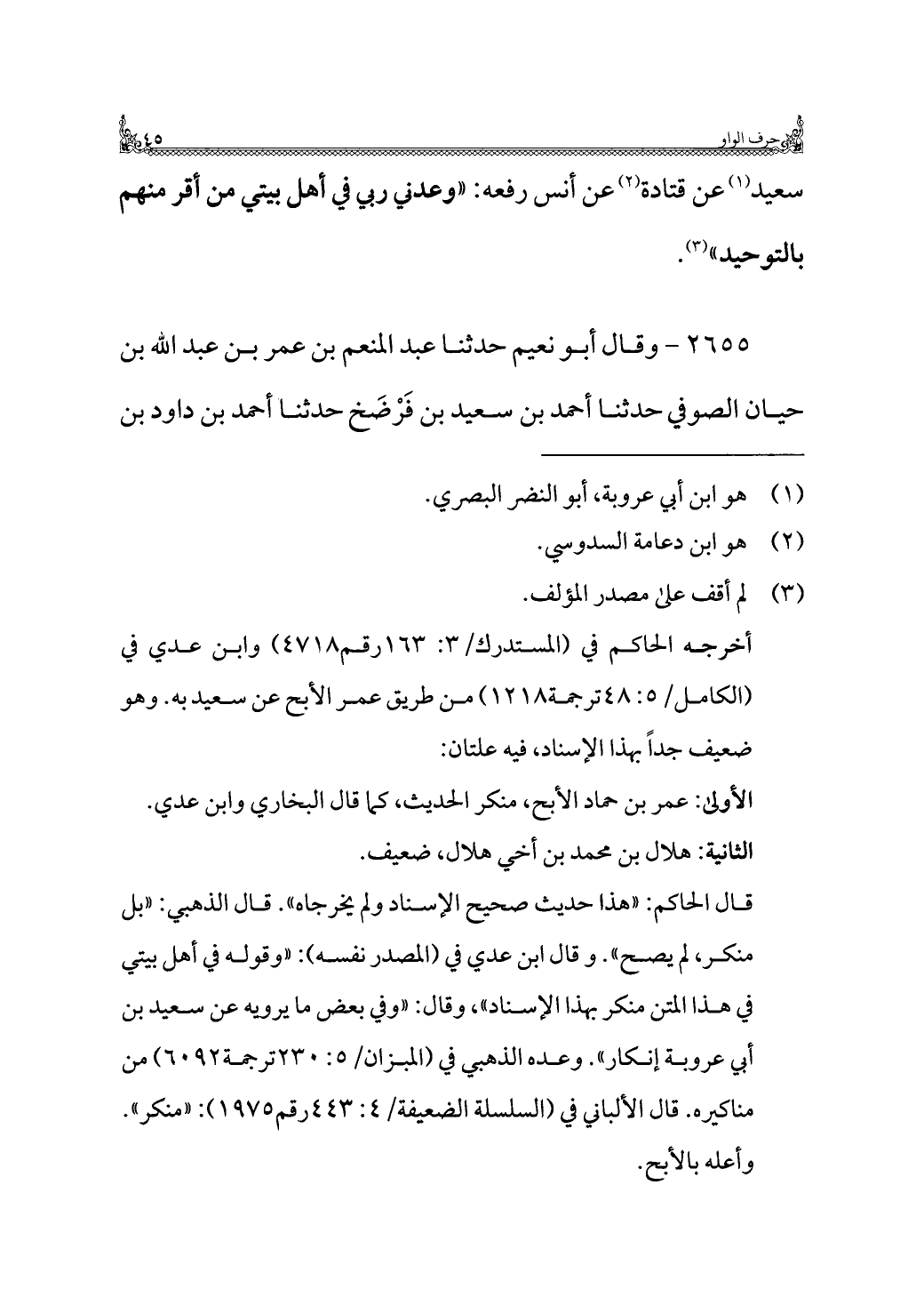 ٢٦٥٥ - وقال أبو نعيم حدثنا عبد المنعم بن عمر بن عبد الله بن حيان الصوفي حدثنا أحمد بن سعيد بن فَرْضَخ حدثنا أحمد بن داود بن