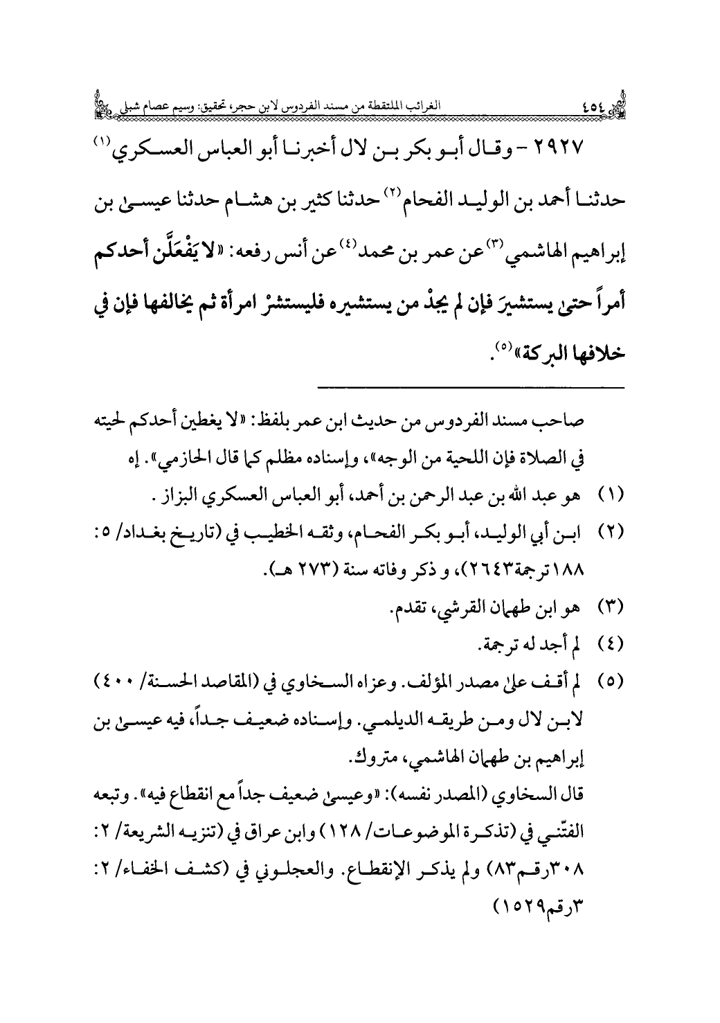 ٢٩٢٧ - وقال أبو بكر بن لال أخبرنا أبو العباس العسكري (¬١) حدثنا أحمد بن الوليد الفحام (¬٢) حدثنا كثير بن هشام حدثنا عيسى بن إبراهيم الهاشمي (¬٣) عن عمر بن محمد (¬٤) عن أنس رفعه: "لا يَفْعَلَّن أحدكم أمرًا حتى يستشيرَ فإن لم يجدْ من يستشيره فليستشرْ امرأة ثم يخالفها فإن في خلافها البركة" (¬٥).