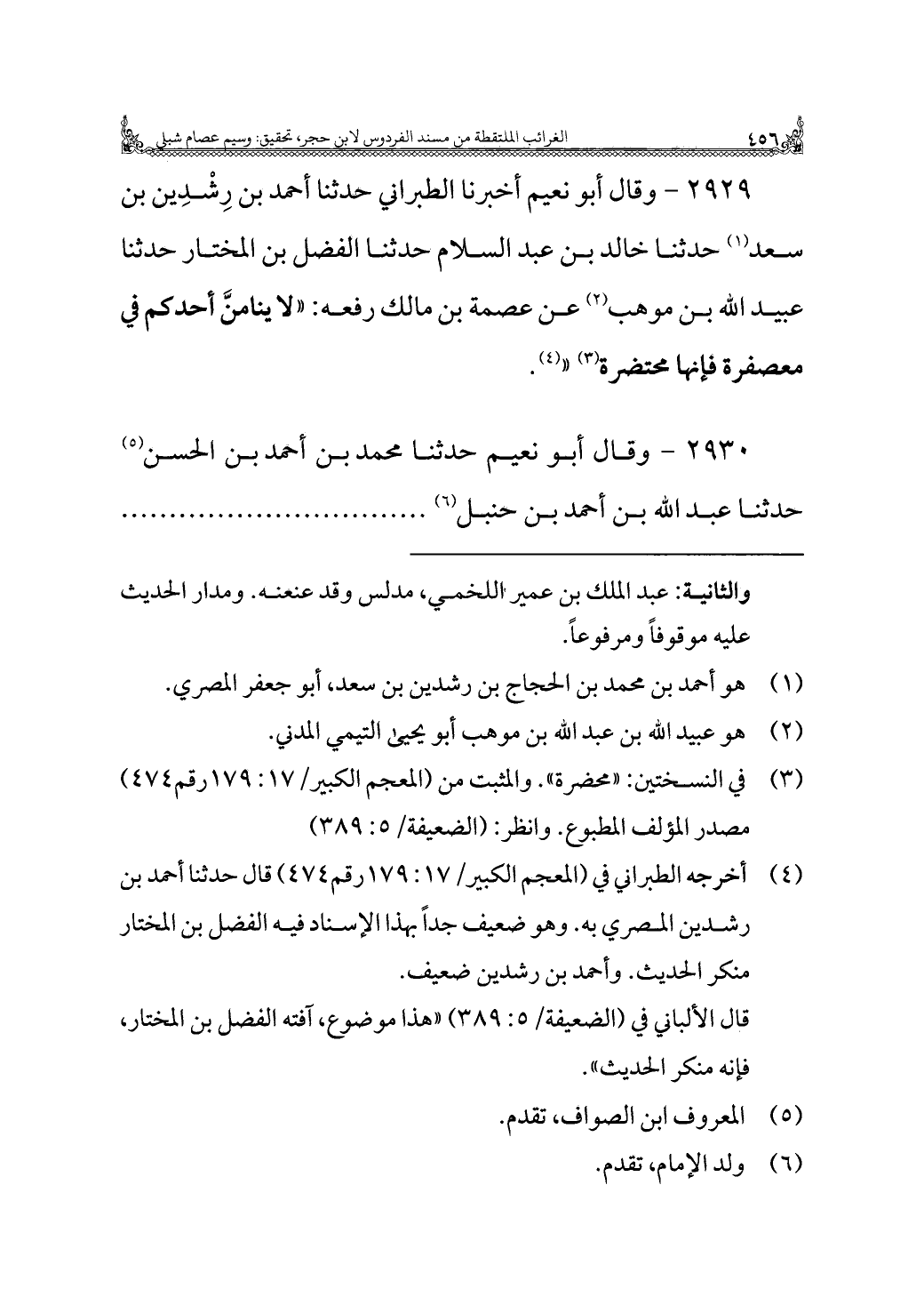 (¬٤) أخرجه الطبراني في (المعجم الكبير/ ١٧: ١٧٩ رقم ٤٧٤) قال حدثنا أحمد بن رشدين المصري به. وهو ضعيف جدًّا بهذا الإسناد فيه الفضل بن المختار منكر الحديث. وأحمد بن رشدين ضعيف.