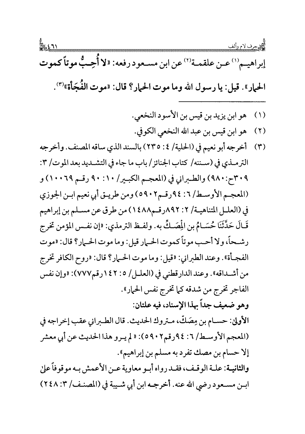 (¬٣) أخرجه أبو نعيم في (الحلية/ ٤: ٢٣٥) بالسند الذي ساقه المصنف. وأخرجه الترمذي في (سننه/ كتاب الجنائز/ باب ما جاء في التشديد بعد الموت/ ٣: ٣٠٩ ح: "٨٠) والطبراني في (المعجم الكبير / ١٠: ٩٠ رقم ١٠٠٦٩) و (المعجم الأوسط/ ٦: ٩٤ رقم ٥٩٠٢) ومن طريق أبي نعيم بن الجوزي في (العلل المتناهية/ ٢: ٨٩٢ رقم ١٤٨٨) من طرق عن مسلم بن إبراهيم قَالَ حَدَّثَنَا حُسَامُ بن المصَكِّ به. ولفظ الترمذي: "إن نفس المؤمن تخرج رشحًا، ولا أحب موتًا كموت الحمار قيل: وما موت الحمار؟ قال: "موت الفجأة". وعند الطبراني: "قيل: وما موت الحمار؟ قال: "روح الكافر تخرج من أشداقه". وعند الدارقطني في (العلل/ ٥: ١٤٢ رقم ٧٧٧): "وإن نفس الفاجر تخرج من شدقه كما تخرج نفس الحمار".