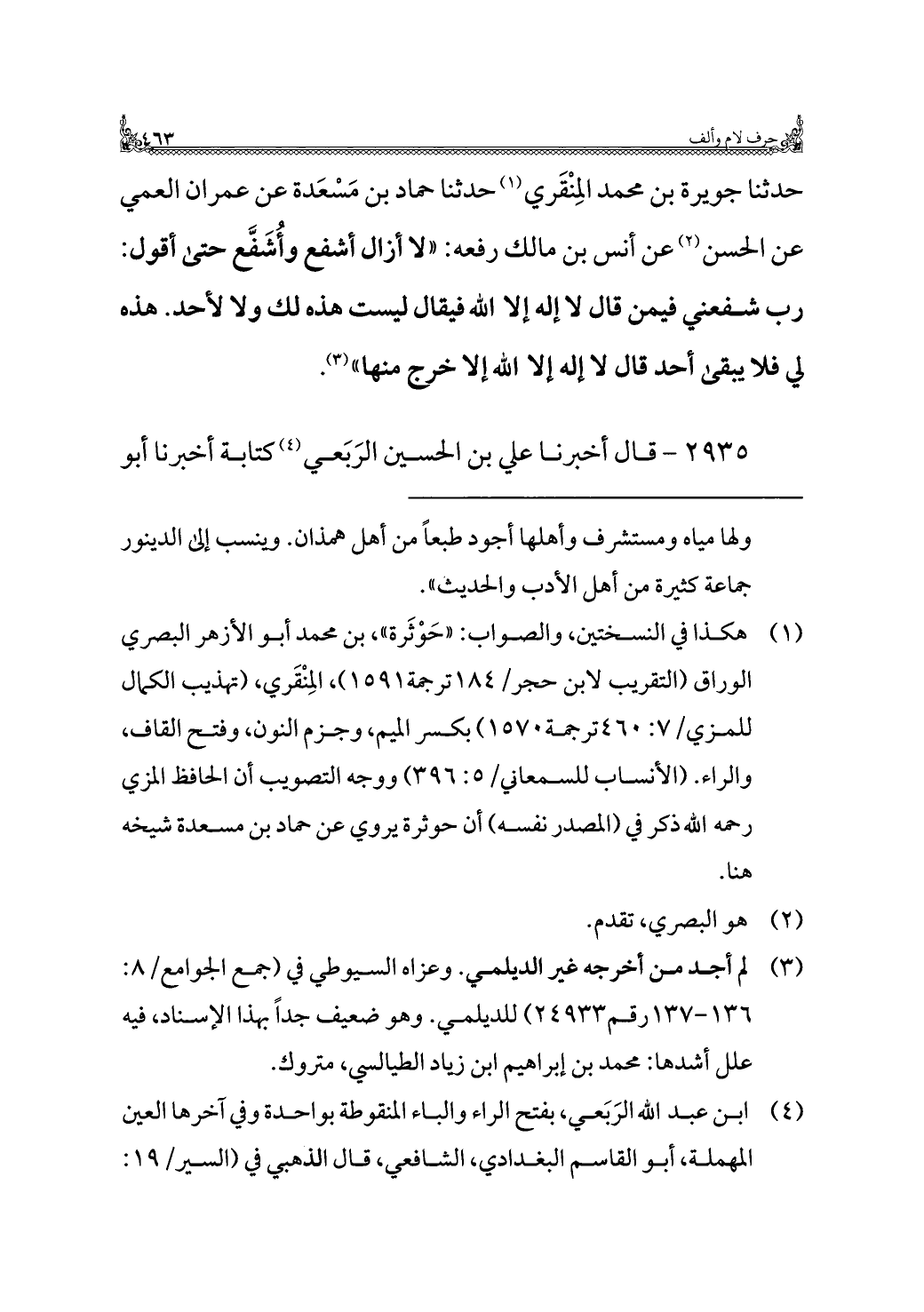 حدثنا جويرة بن محمد المِنْقَري (¬١) حدثنا حماد بن مَسْعَدة عن عمران العمي عن الحسن (¬٢) عن أنس بن مالك رفعه: "لا أزال أشفع وأُشَفَّع حتى أقول: رب شفعني فيمن قال لا إله إلا الله فيقال ليست هذه لك ولا لأحد. هذه لي فلا يبقى أحد قال لا إله إلا الله إلا خرج منها" (¬٣).