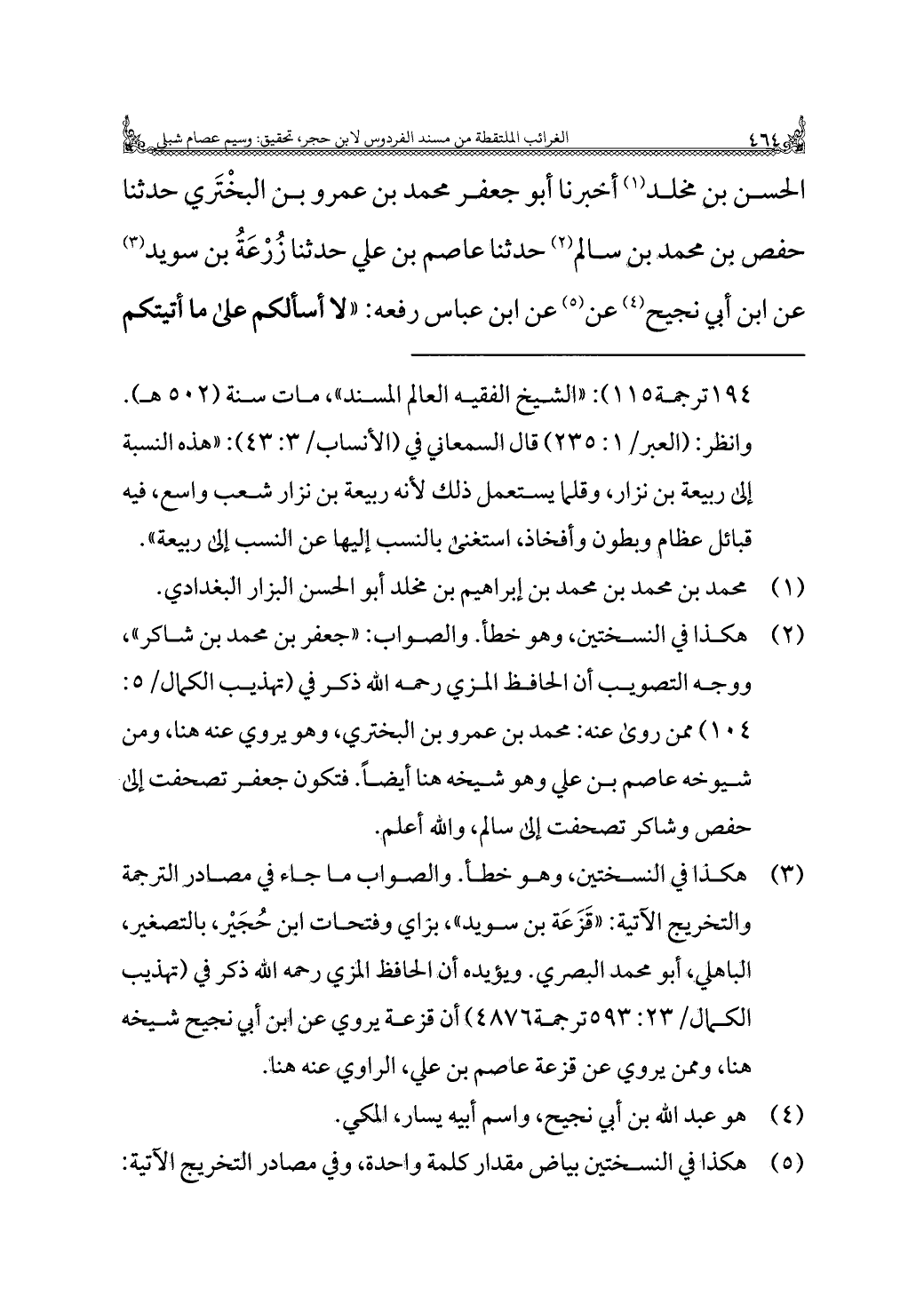 (¬٢) هكذا في النسختين، وهو خطأ. والصواب: "جعفر بن محمد بن شاكر"، ووجه التصويب أن الحافظ المزي رحمه الله ذكر في (تهذيب الكمال/ ٥: ١٠٤) ممن روى عنه: محمد بن عمرو بن البختري، وهو يروي عنه هنا، ومن شيوخه عاصم بن علي وهو شيخه هنا أيضًا. فتكون جعفر تصحفت إلى حفص وشاكر تصحفت إلى سالم، والله أعلم.
