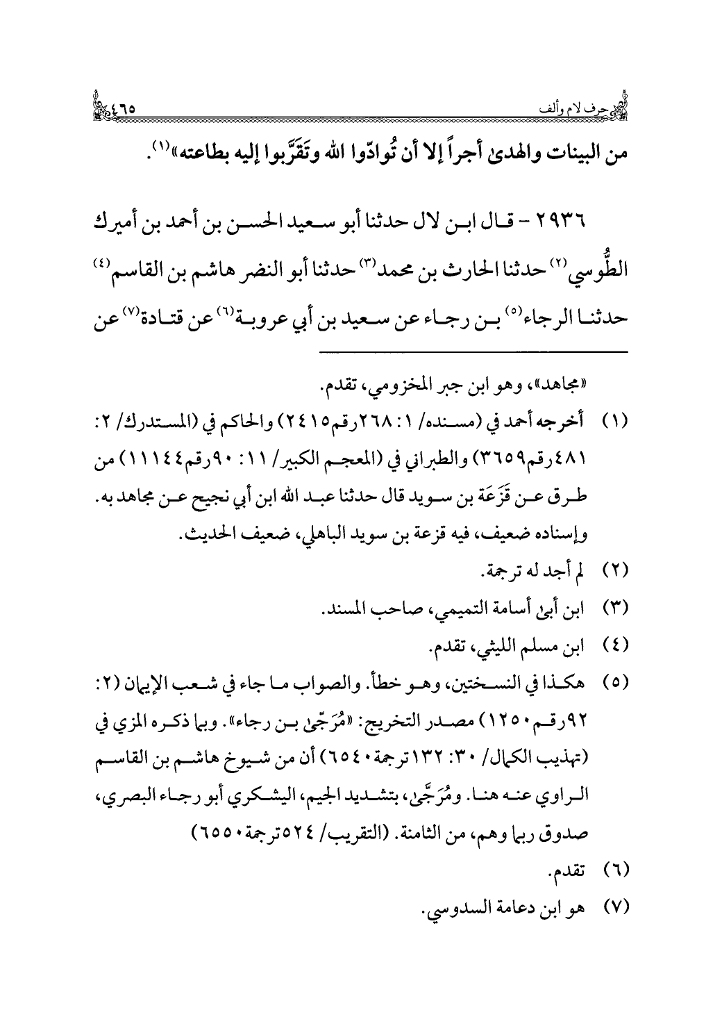 ٢٩٣٦ - قال ابن لال حدثنا أبو سعيد الحسن بن أحمد بن أميرك الطُّوسي (¬٢) حدثنا الحارث بن محمد (¬٣) حدثنا أبو النضر هاشم بن القاسم (¬٤) حدثنا الرجاء (¬٥) بن رجاء عن سعيد بن أبي عروبة (¬٦) عن قتادة (¬٧) عن
