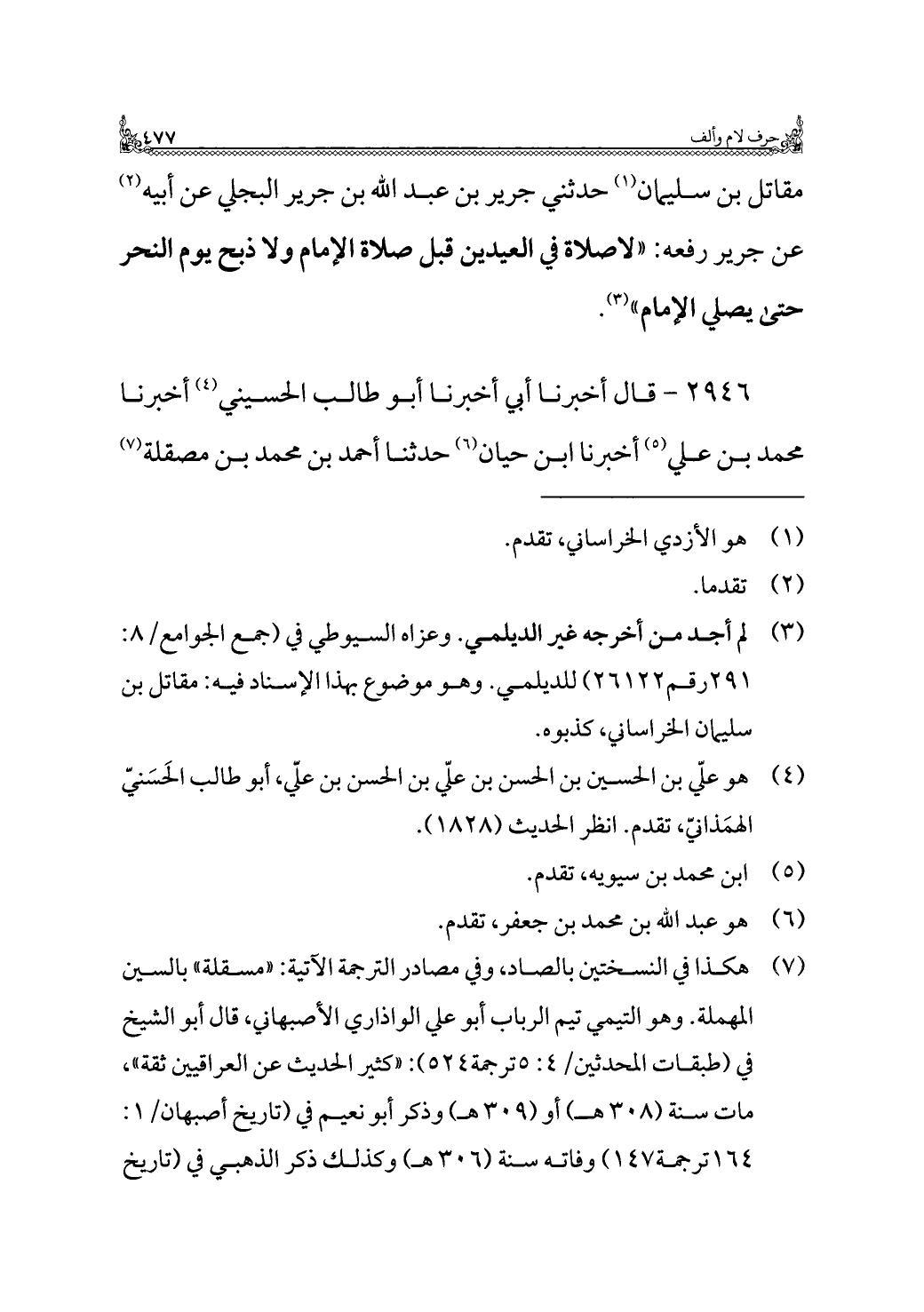 مقاتل بن سليمان (¬١) حدّثني جرير بن عبد الله بن جرير البَجَلي عن أبيه (¬٢) عن جرير رفعه: "لا صلاة في العيدين قبل صلاة الإِمام ولا ذبح يوم النحر حَتَّى يصلي الإِمام" (¬٣).