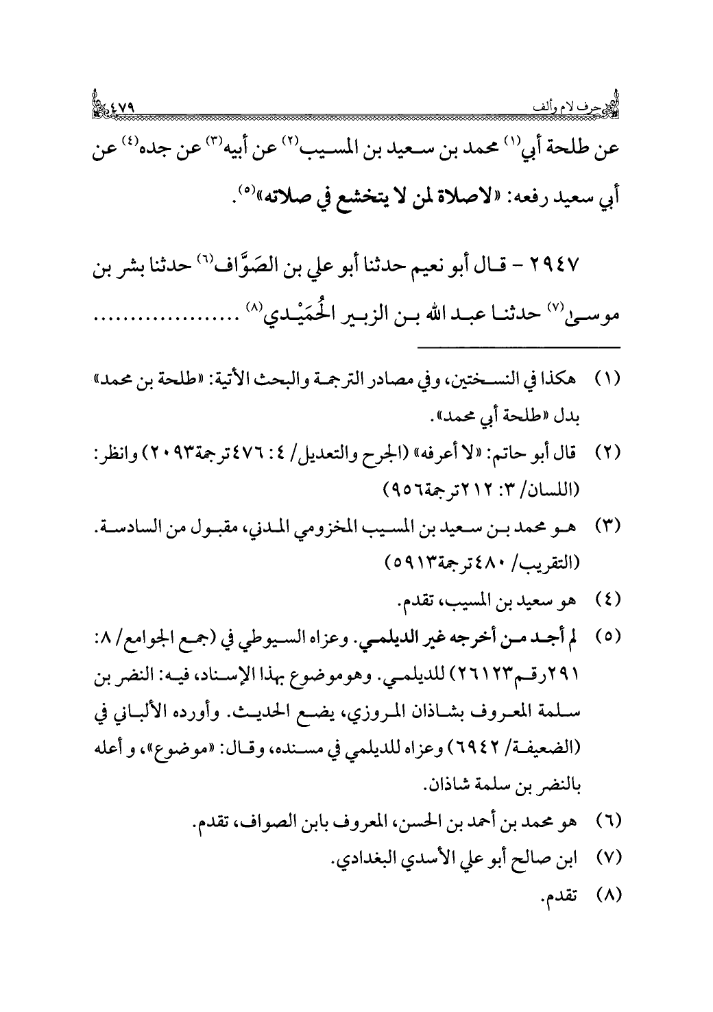 عن طلحة أبي (¬١) محمد بن سعيد بن المسيب (¬٢) عن أبيه (¬٣) عن جده (¬٤) عن أبي سعيد رفعه: "لا صلاة لمن لا يتخشع في صلاته" (¬٥).