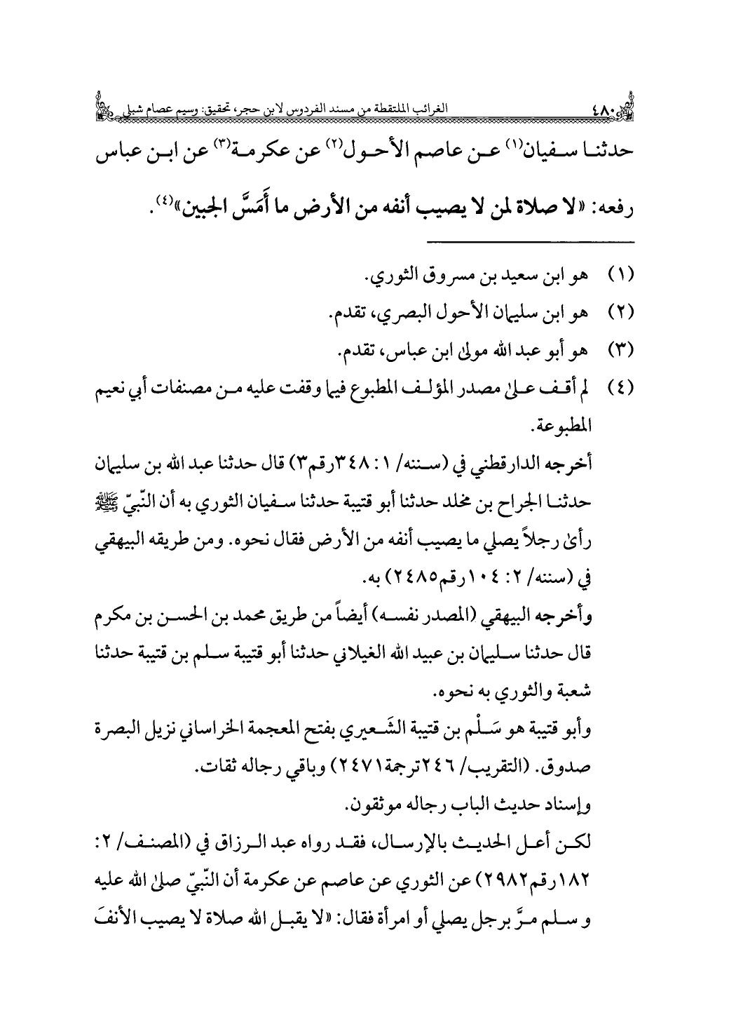 أخرجه الدارقطني في (سننه/ ١: ٣٤٨ رقم ٣) قال حدثنا عبد الله بن سليمان حدثنا الجراح بن مخلد حدثنا أبو قتيبة حدثنا سفيان الثوري به أن النّبيّ - صَلَّى اللهُ عَلَيْهِ وَسَلَّمَ - رأى رجلًا يصلي ما يصيب أنفه من الأرض فقال نحوه. ومن طريقه البيهقي في (سننه/ ٢: ١٠٤ رقم ٢٤٨٥) به.