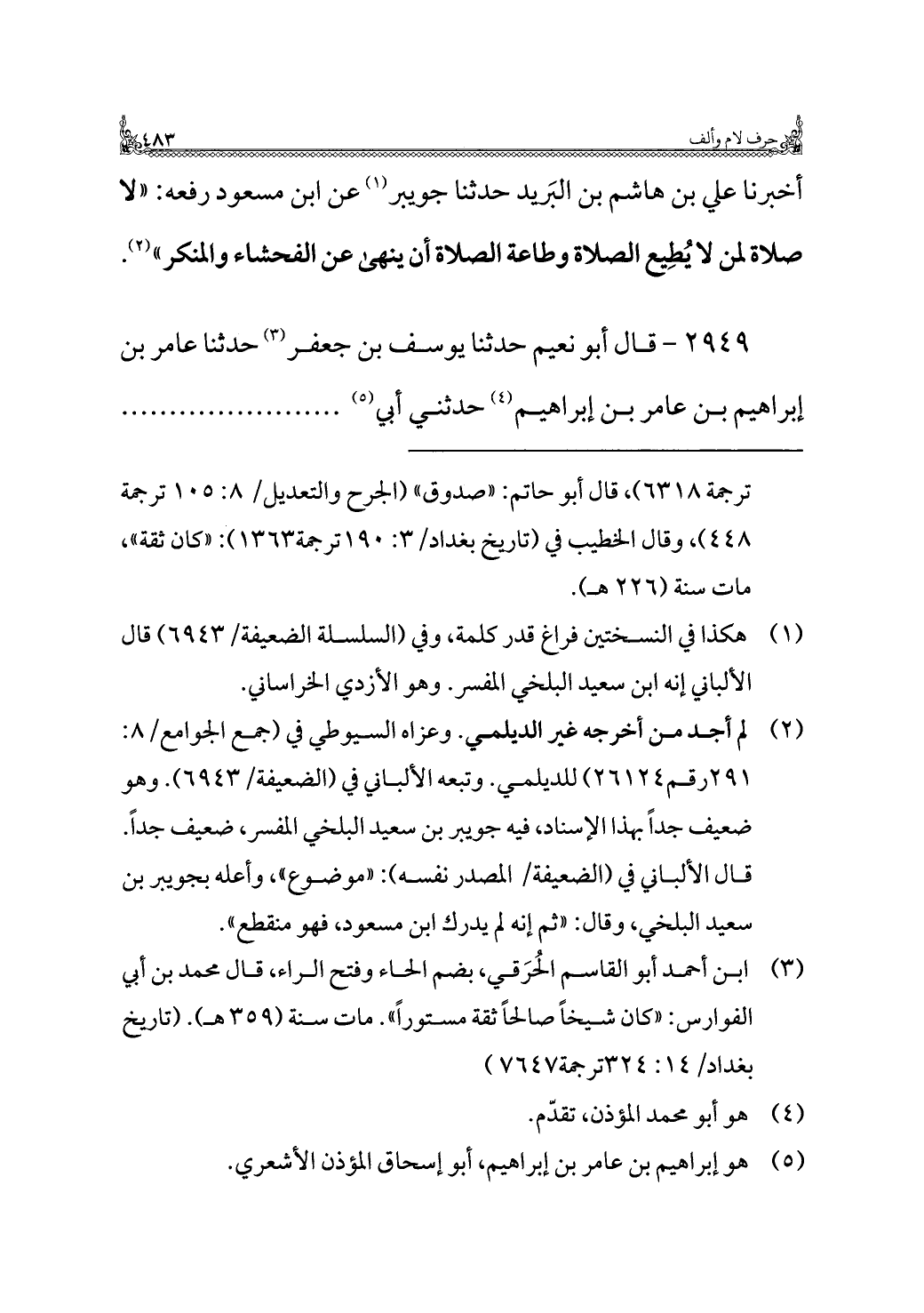 أخبرنا علي بن هاشم بن البَريد حدثنا جويبر (¬١) عن ابن مسعود رفعه: "لا صلاة لمن لا يُطِيع الصلاة وطاعة الصلاة أن ينهى عن الفحشاء والمنكر" (¬٢).