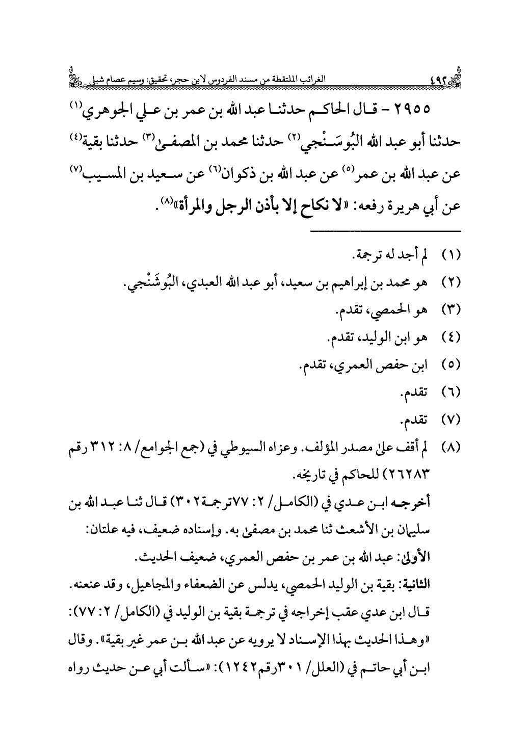 قال ابن عدي عقب إخراجه في ترجمة بقية بن الوليد في (الكامل/ ٢: ٧٧): "وهذا الحديث بهذا الإسناد لا يرويه عن عبد الله بن عمر غير بقية". وقال ابن أبي حاتم في (العلل / ٣٠١ رقم ١٢٤٢): "سألت أبي عن حديث رواه =