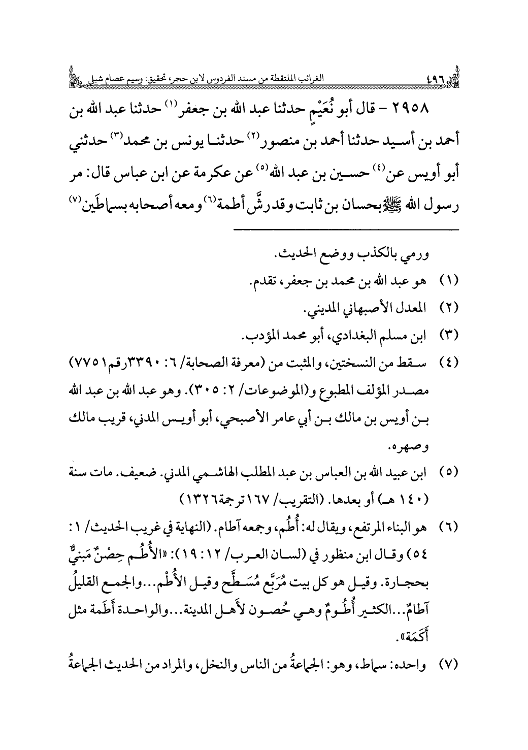 ٢٩٥٨ - قال أبو نُعَيْمٍ حدثنا عبد الله بن جعفر (¬١) حدثنا عبد الله بن أحمد بن أسيد حدثنا أحمد بن منصور (¬٢) حدثنا يونس بن محمد (¬٣) حدّثني أبو أويس عن (¬٤) حسين بن عبد الله (¬٥) عن عكرمة عن ابن عباس قال: مر رسول الله - صَلَّى اللهُ عَلَيْهِ وَسَلَّمَ - بحسان بن ثابت وقد رشَّ أطمة (¬٦) ومعه أصحابه بسماطَين (¬٧)