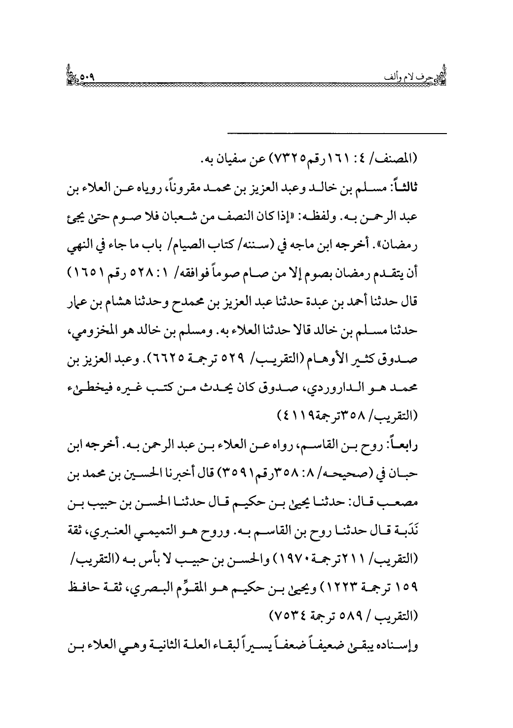 ثالثًا: مسلم بن خالد وعبد العزيز بن محمد مقرونًا، روياه عن العلاء بن عبد الرَّحمن به. ولفظه: "إِذَا كان النصف من شعبان فلا صوم حَتَّى يجئ رمضان". أخرجه ابن ماجة في (سننه/ كتاب الصيام/ باب مَا جَاءَ في النهي أن يتقدم رمضان بصوم إلَّا من صام صومًا فوافقه/ ١: ٥٢٨ رقم ١٦٥١) قال حدثنا أحمد بن عبدة حدثنا عبد العزيز بن محمدح وَحَدَّثَنَا هشام بن عمار حدثنا مسلم بن خالد قالا حدثنا العلاء به. ومسلم بن خالد هو المخزومي، صدوق كثير الأوهام (التقريب/ ٥٢٩ ترجمة ٦٦٢٥). وعبد العزيز بن محمد هو الداروردي، صدوق كان يحدث من كتب غيره فيخطيء (التقريب/ ٣٥٨ ترجمة ٤١١٩).