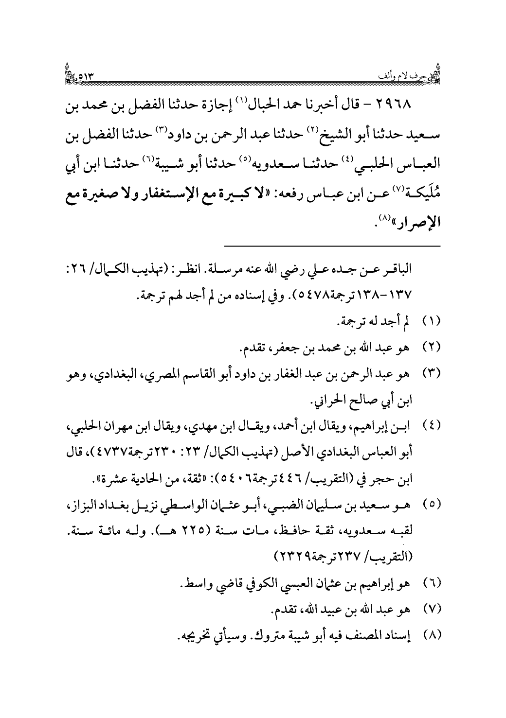 ٢٩٦٨ - قال أخبرنا حمد الحبال (¬١) إجازة حدثنا الفضل بن محمد بن سعيد حدثنا أبو الشيخ (¬٢) حدثنا عبد الرَّحمن بن داود (¬٣) حدثنا الفضل بن العباس الحلبي (¬٤) حدثنا سعدويه (¬٥) حدثنا أبو شيبة (¬٦) حدثنا ابن أبي مُلَيكة (¬٧) عن ابن عباس رفعه: "لا كبيرة مع الإستغفار ولا صغيرة مع الإصرار" (¬٨).