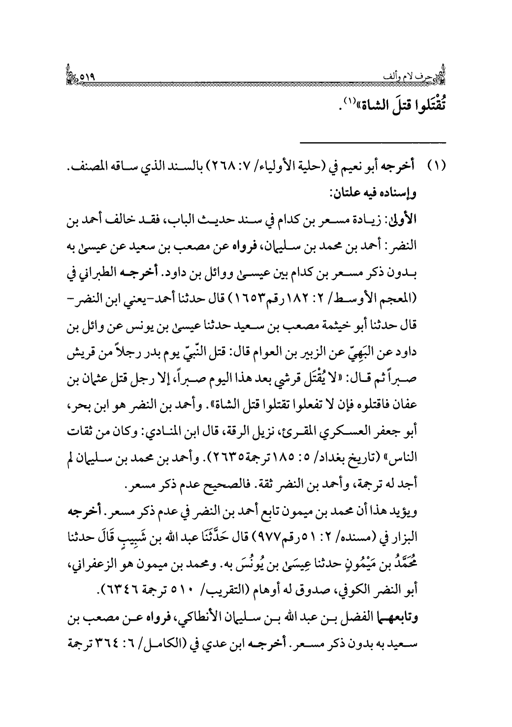 الأولى: زيادة مسعر بن كدام في سند حديث الباب، فقد خالف أحمد بن النضر: أحمد بن محمد بن سليمان، فرواه عن مصعب بن سعيد عن عيسى به بدون ذكر مسعر بن كدام بين عيسى ووائل بن داود. أخرجه الطبراني في (المعجم الأوسط/ ٢: ١٨٢ رقم ١٦٥٣) قال حدثنا أحمد - يعني ابن النضر - قال حدثنا أبو خيثمة مصعب بن سعيد حدثنا عيسى بن يونس عن وائل بن داود عن البَهِيّ عن الزبير بن العوام قال: قتل النّبيّ يوم بدر رجلًا من قريش صبرًا ثم قال: "لا يُقْتَل قرشي بعد هذا اليوم صبرًا، إلَّا رجل قتل عثمان بن عفان فاقتلوه فإن لا تفعلوا تقتلوا قتل الشاة". وأحمد بن النضر هو ابن بحر، أبو جعفر العسكري المقرئ، نزيل الرقة، قال ابن المنادي: وكان من ثقات النّاس" (تاريخ بغداد/ ٥: ١٨٥ ترجمة ٢٦٣٥). وأحمد بن محمد بن سليمان لم أجد له ترجمة، وأحمد بن النضر ثقة. فالصحيح عدم ذكر مسعر.