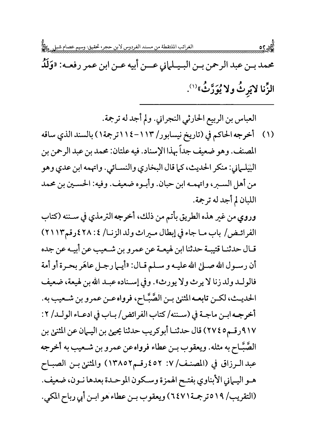 محمد بن عبد الرحمن بن البيلماني عن أبيه عن ابن عمر رفعه: "وَلَدُ الزِّنا لا يَرِثُ ولا يُوَرَّثُ" (¬١).