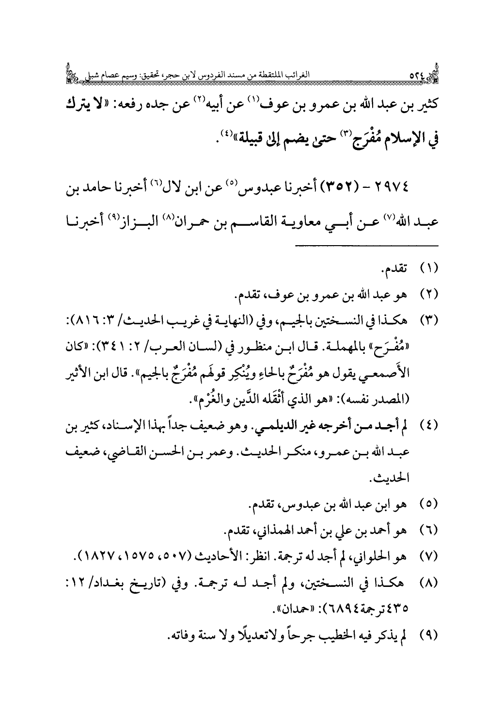 كثير بن عبد الله بن عمرو بن عوف (¬١) عن أبيه (¬٢) عن جده رفعه: "لا يترك في الإسلام مُفْرَج (¬٣) حتى يضم إلى قبيلة" (¬٤).