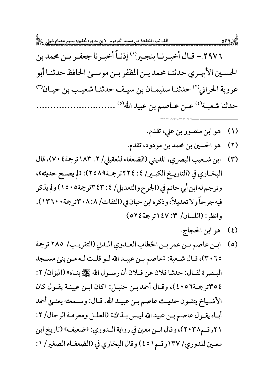 ٢٩٧٦ - قال أخبرنا بنجير (¬١) إذنًا أخبرنا جعفر بن محمد بن الحسين الأبهري حدثنا محمد بن المظفر بن موسى الحافظ حدثنا أبو عروبة الحراني (¬٢) حدثنا سليمان بن سيف حدثنا شعيب بن حيَّان (¬٣) حدثنا شعبة (¬٤) عن عاصم بن عبيد الله (¬٥)