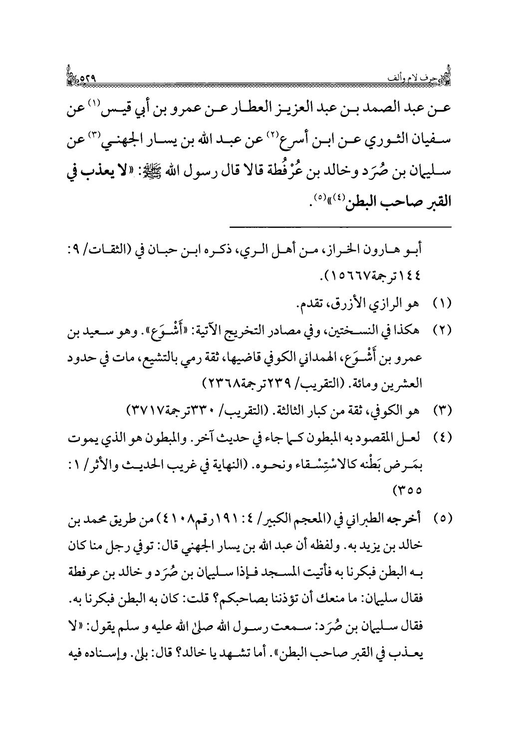 عن عبد الصمد بن عبد العزيز العطار عن عمرو بن أبي قيس (¬١) عن سفيان الثوري عن ابن أسرع (¬٢) عن عبد الله بن يسار الجهني (¬٣) عن سليمان بن صُرَد وخالد بن عُرْفُطة قالا قال رسول الله - صلى الله عليه وسلم -: "لا يعذب في القبر صاحب البطن (¬٤) " (¬٥).