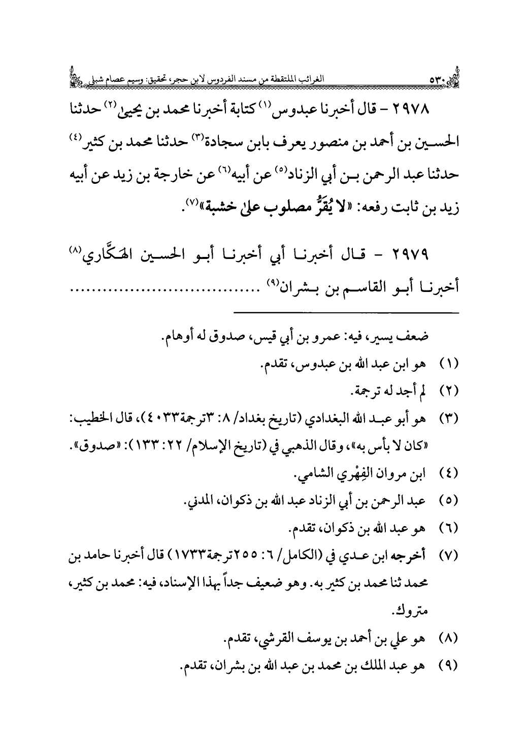 ٢٩٧٨ - قال أخبرنا عبدوس (¬١) كتابة أخبرنا محمد بن يحيى (¬٢) حدثنا الحسين بن أحمد بن منصور يعرف بابن سجادة (¬٣) حدثنا محمد بن كثير (¬٤) حدثنا عبد الرحمن بن أبي الزناد (¬٥) عن أبيه (¬٦) عن خارجة بن زيد عن أبيه زيد بن ثابت رفعه: "لا يُقَرُّ مصلوب على خشبة" (¬٧).