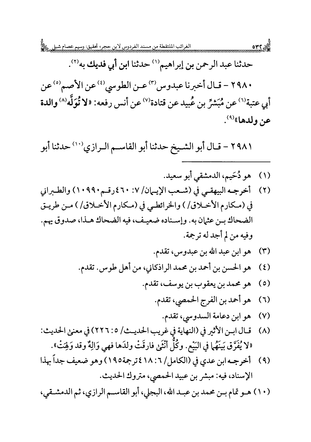٢٩٨٠ - قال أخبرنا عبدوس (¬٣) عن الطوسي (¬٤) عن الأصم (¬٥) عن أبي عتبة (¬٦) عن مُبَشِّر بن عُبيد عن قتادة (¬٧) عن أنس رفعه: "لا تُوَلَّه (¬٨) والدة عن ولدها" (¬٩).