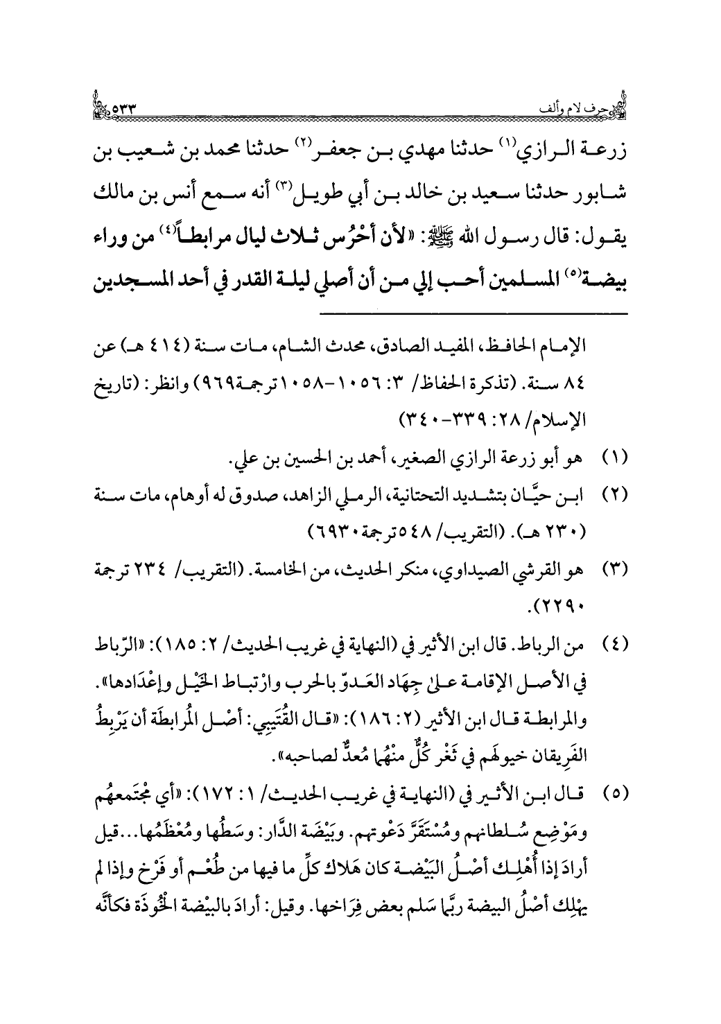 زرعة الرازي (¬١) حدثنا مهدي بن جعفر (¬٢) حدثنا محمد بن شعيب بن شابور حدثنا سعيد بن خالد بن أبي طويل (¬٣) أنه سمع أنس بن مالك يقول: قال رسول الله - صلى الله عليه وسلم -: "لأن أحْرُس ثلاث ليال مرابطًا (¬٤) من وراء بيضة (¬٥) المسلمين أحب إلي من أن أصلي ليلة القدر في أحد المسجدين