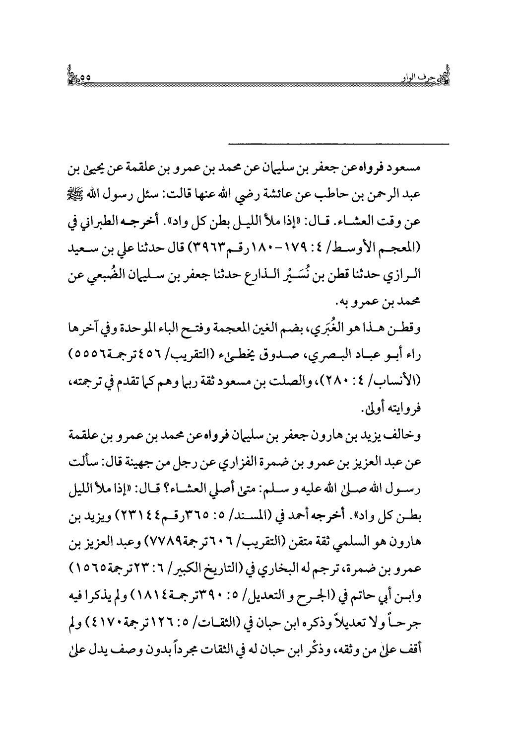= مسعود فرواه عن جعفر بن سليمان عن محمد بن عمرو بن علقمة عن يحيى بن عبد الرحمن بن حاطب عن عائشة -رضي الله عنها- قالت: سئل رسول الله -صلى الله عليه وسلم- عن وقت العشاء. قال: "إذا ملأ الليل بطن كل واد". أخرجه الطبراني في (المعجم الأوسط / ٤: ١٧٩ - ١٨٠ رقم ٣٩٦٣) قال حدثنا علي بن سعيد الرازي حدثنا قطن بن نُسَيْر الذارع حدثنا جعفر بن سليمان الضُبعي عن محمد بن عمرو به.