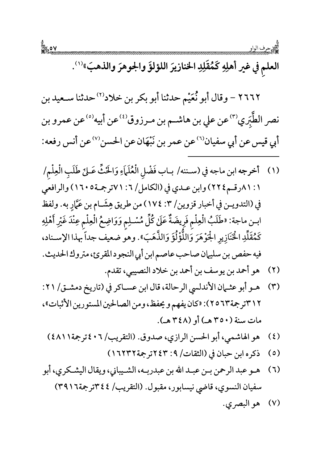(¬١) أخرجه ابن ماجه في (سننه/ باب فَضْلِ الْعُلَماَءِ وَالحْثِّ عَلى طَلَبِ الْعِلْمِ/ ١: ٨١ رقم ٢٢٤) وابن عدي في (الكامل/ ٦: ٧١ ترجمة ١٦٠٥) والرافعي في (التدوين في أخبار قزوين/ ٣: ١٧٤) من طريق هِشَام بن عَمَّارِ به. ولفظ ابن ماجة: "طَلَبُ الْعِلْمِ فَرِيضَةٌ عَلَى كُلِّ مُسْلِمٍ وَوَاضِعُ الْعِلْمِ عِنْدَ غَيْرِ أَهْلِهِ كَمُقَلِّدِ الْخَنَازِيرِ الْجَوْهَرَ وَاللُّؤْلُؤَ وَالذَّهَبَ". وهو ضعيف جدًا بهذا الإسناد، فيه حفص بن سليمان صاحب عاصم ابن أبي النجود المقرئ، متروك الحديث.